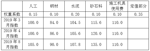 某市政工程投标截止日期为2019年4月20日,确定中标人后,工程于2019年6月1日开工。施工合同约定,工程价款结算时人工、钢材、水泥、砂石料及施工机具使用费采用价格指数法调差,各项权重系数及价格指数见下表。2019年8月,承包人当月完成清单子目价款2000万元,当月按已标价工程量清单价格确认的变更金额为200万元,则本工程2019年8月的价格调整金额为( )万元。