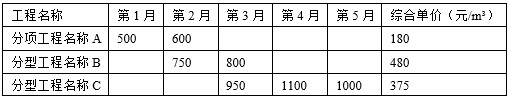 某工程项目由A、B、C三个分项工程组成,采用工程量清单招标确定中标人,合同工期5个月。各月计划完成工程量及综合单价见表5-1,承包合同规定:(1)开工前发包方向承包方式支付分部分项工程费的15%作为材料预付款。预付款从工程开工后的第2个月开始分3个月均摊抵扣。(2)工程进度款按月结算,发包方每月支付承包方应得工程款的90%。(3)措施项目工程款在开工前和开工后第1个月末分两次平均支付。(4)分项工程累计实际完成工程量超过计划完成工程量的10%时,该分项工程超出部分的工程量的综合单价调整系数为0.95.(5)措施项目费以分部分项工程费用的2%计取,其他项目费20.86万元,规费综合费率3.5%(以分部分项工程费、措施项目费、其他项目费之和为基数),税金率3.35%。表5-1各月计划完成工程量及综合单价表