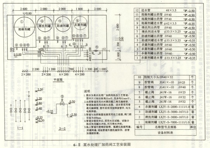 2. 根据安装图计算φ48×3.5进水管、DN40出药管的工程量和DN40出药管上的法兰工程量(计算范围以图示边框为界,管道与设备连接处按设备外框线考虑),并将工程量计算式填入答题纸指定位置,编制DN40出药管安装和所有阀门安装的分部分项工程量清单项目,并将相关数据内容填入“分部分项工程迠淸单及计价表”(答题纸表6-Ⅱ-3)中(不计算计价部分)。(金额保留2位小数)