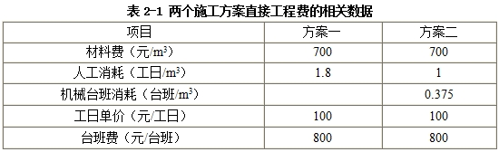 某工程有两个备选施工方案,采用方案一时,固定成本为160万元,与工期有关的费用为35万元/月;采用方案二时,固定成本为200万元,与工期有关的费用为25万元/月。两方案除方案一机械台班消耗以后的直接工程费相关数据见表2-1。