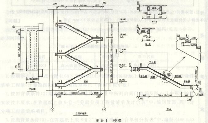 Ⅰ.土建工程某专业设施运行控制楼的一端上部设有一室外楼梯。楼梯主要结构由现浇钢筋混凝土平台梁、平台板、梯梁和踏步板组成,其他部位不考虑。局部结构布置,如图6-1所示,每个楼梯段梯梁侧面的垂直投影面积(包括平台板下部)可按5.01m2计算。现浇混凝土强度等级均为C30,采用5~20mm粒径的碎石、中粗砂和42.5的硅酸盐水泥拌制。