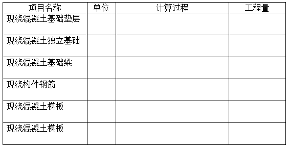 根据工程图纸及技术参数,按《房屋建筑与装饰工程工程量计算规范》(GB 50854—2013)的计算规则,在“工程量计算表”中,列式计算现浇混凝土基础垫层、现浇混凝土独立基础(-0.3米以下部分)、现浇混凝土基础梁、现浇构件钢筋、现浇混凝土模板五项分部分项工程的工程量。根据已有类似项目计算资料测算,各钢筋混凝土基础钢筋参考含量分别为:独立基础80kg/m3,基础梁100kg/m3。(基础梁施工是在基础回填土填至-1.00米时再进行基础梁施工);