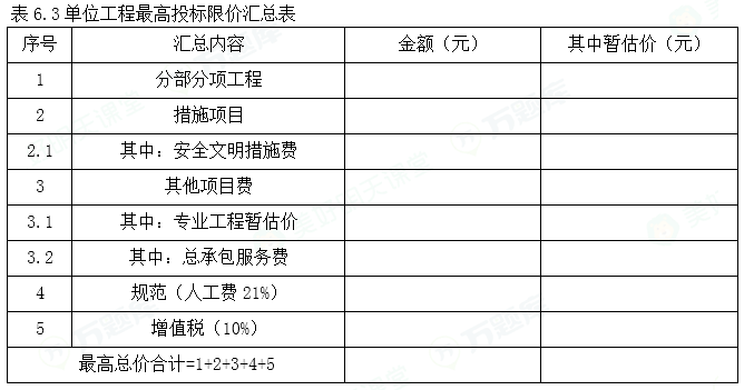 假定该整体烟囱分部分项工程费为2,000,000.00元;单价措施项目费为150,000.00元,总价措施项目仅考虑安全文明施工费,安全文明施工费按分部分项工程费的3.5%计取;其他项目考虑基础基坑开挖的土方、护坡、降水专业工程暂估价为110,000.00元(另计5%总承包服务费);人工费占比分别为分部分项工程费的8%、措施项目费的15%;规费按照人工费的21%计取,增值税税率按10%计取。按《建设工程工程量清单计价规范》(GB50584-2013)的要求,在答题卡中列示计算安全文明施工费、措施项目费、人工费、总承包服务费、规费、增值税;并在答题卡表6.3“单位工程最高投标限价汇总表”中编制该钢筋混凝土多管式(钢内筒)烟囱单位工程最高投标限价。(1)安全文明施工费(2)措施项目费(3)人工费(4)总承包服务费(5)规费(6)增值税