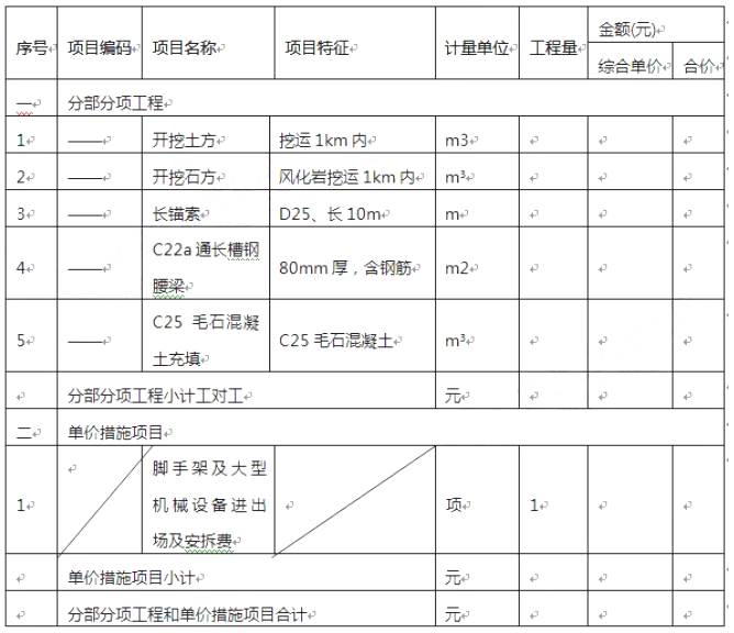 已知22a通长槽钢腰梁综合单价为435.09元/m,C25石混凝土充填综台单价为335.60元/m3,脚手架和大型机械设备进出场及安拆费等单价措施项目费用测算结果为340000.00元。根据问题1和问题2的计算结果,以及表5.1中相应的综合单价、答题:卡表中相关的信息,按《房屋建筑与装饰工程工程量计算规范》(GB50854-2013)的计算规则,在答题卡表5.3中,编制该预应力长锚索边坡支护方案分部分项工程和单价措施项目清单与计价表。