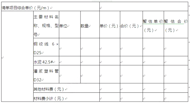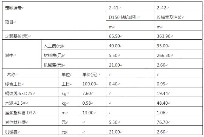 若企业管理费按人工、材料、机械费之和的(10%计取,利润按人工、材料、机械、企业管理费之和的7%计取。根据表5.2中的数据,按《建设工程工程量清单计价规范》(GB50500-2013)的计算规则,在答题卡表5.2中,编制该预应力长锚索综合单价分析表(预应力长锚索工程量计量方法,基础定额与清单规范相同,均按设计图示尺寸,以长度(m)为单位)。