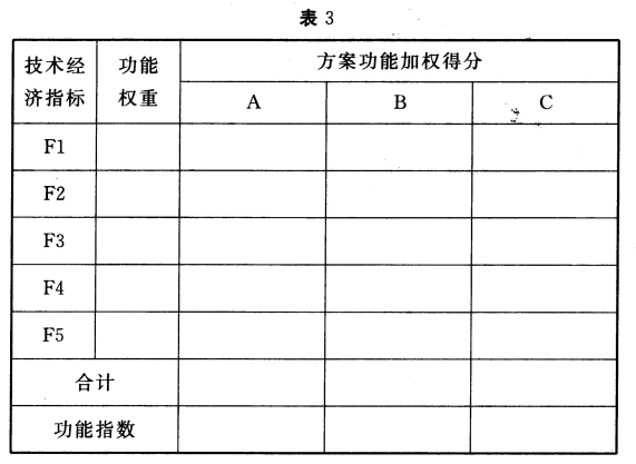 列表计算各方案的功能指数,将计算结果填入答题卡表3中。