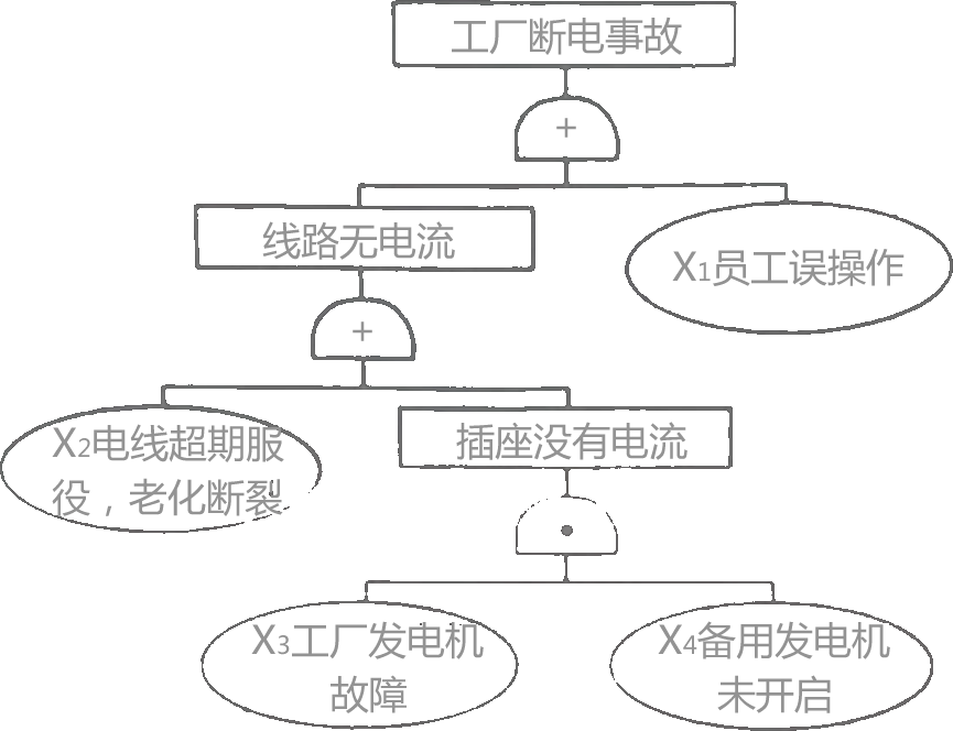 某化工厂在生产过程中出现断电事故。运用事故树法进行分析后,得出可能造成事故发生的原因逻辑关系见下图。根据该图,可判定断电事故的基本原因是( )。