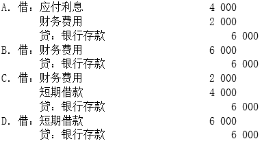 2020年7月1日,某企业借入生产经营用借款600 000元,期限6个月,年利率4%。该借款的利息按月计提、季度末支付借款本金到期一次偿还。下列各项中,2020年9月30日该企业支付借款利息的会计处理正确的是( )。