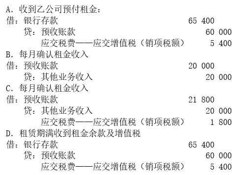 甲公司为增值税一般纳税人,2019年7月30日与乙公司签订租赁合同,约定从8月1日开始向乙公司租赁厂房,租赁期6个月,含税租金共计130 800元,合同约定,签订合同日预付含税租金65 400元,合同到期结清全部租金余款。合同签订日,甲公司收到租金并存入银行,开具增值税发票时即发票注明租金60 000元、增值税5 400元。租赁期满,甲公司收到租金余款及相应增值税,下列账务处理正确的有( )。