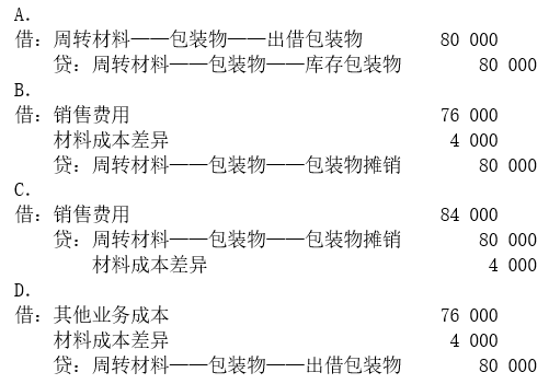 2019年12月1日,某企业出借一批包装物,按计划成本计价,计划成本为80 000元,材料成本差异率为-5%,该包装物成本一次摊销。下列关于对该包装物摊销的会计处理中,正确的是( )。