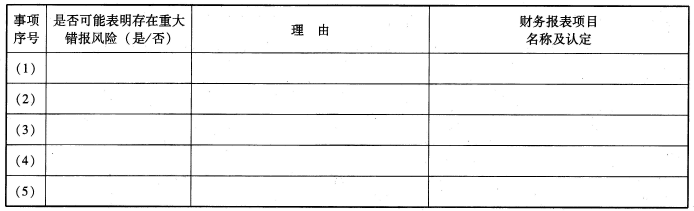 针对资料一第(1)至(5)项,结合资料二,假定不考虑其他条件,逐项指出资料一所列事项是否可能表明存在重大错报风险。如果认为可能表明存在重大错报风险,简要说明理由,并说明该风险主要与哪些财务报表项目的哪些认定相关(不考虑税务影响)。将答案直接填入答题区的相应表格内。