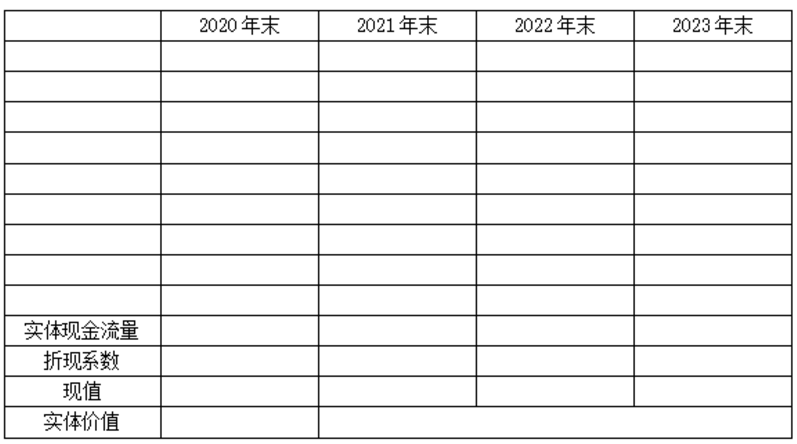 基于上述结果,计算2021—2023年乙医院实体现金流量,并采用实体现金流量折现法,估计2020年末乙医院实体价值(计算过程和结果填入下方表格中)。
