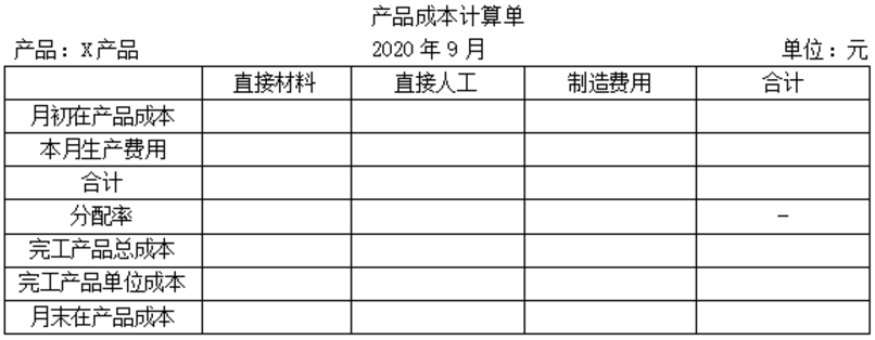 <p>编制X产品的产品成本计算单(结果填入下方表格中,不用列出计算过程)。<img title="" alt="" width=