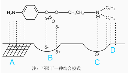 普鲁卡因在体内与受体之间存在多种结合形式,结合模式如图所示,图中,B区域的结合形式是( )。