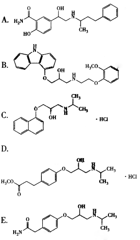 拉贝洛尔是α、β受体阻断药,降压作用出现快,心律影响小,副作用小,近年来成为妊娠高血压的首选药。拉贝洛尔属于苯乙醇胺结构,有2个手性中心,四个异构体,阻断β受体活性来自于(R,R)-异构体,阻断α受体活性来自于(S,R)-异构体,其余(S,S)-异构体和(R,S)-异构体无活性。拉贝洛尔的结构是( )。