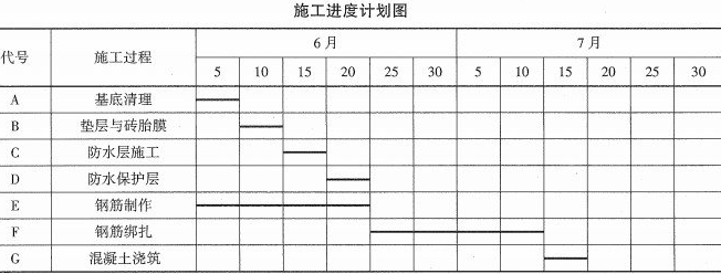 某项目基础底板施工,合同约定工期45天,项目经理部根据业主提供的电子版图纸编制了施工进度(如图),底板施工暂未考虑流水施工。施工进度计划图因业主未按时提供正式图纸,致使工序E在6月6日才开始。基于安全考虑,建设单位要求仍按原合同约定的时间完成底板施工,为此施工单位采取调整劳动力计划,增加劳动力等措施,在15天内完成了2700t钢筋制作(工效为4.5t/人.工作日)。