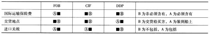 (4)关于风险转移界线,按照FOB术语成交的,货物灭失或损坏的风险在货物交到船上时转移;按照CIF术语成交的,货物在装运港装船时,货物灭失或损坏的风险在货物交到船上时转移;按照DDP术语成交的,卖方在进口国内的交货地点完成交货时,风险由卖方转移给买方。