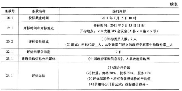 A县教育局利用财政拨款采购多功能教学仪20台。该设备供货项目概算1000万元人民币。考虑到教学仪技术复杂,经批准采用邀请招标方式实施采购。教育局依法委托政府采购中心采购。政府采购中心于2011年5月10日向教育局指定的5家供应商发出招标文件。招标文件中投标人须知前附表的部分内容见表6-3。