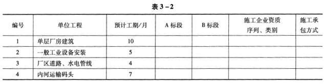 招标合同标段划分主要考虑以下因素:(1)法律法规;(2)工程承包管理模式;(3)工程管理力量;(4)市场竞争格局;(5)技术关联因素;(6)工期与规模。本案例从技术关联性的角度,可将所有单位工程分为厂区部分(包括编号1,2,3的单位工程)以及运输码头两个标段分别组织招标,分别选定两个施工总承包商来完成两个标段。其中,第一标段的工业设备安装与厂区道路、水电管线可由总承包商进行专业分包。填表结果如表3-3所示。