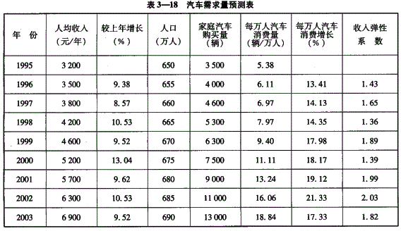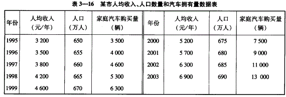 (1)咨询公司对国内大中城市家庭轿车需求量进行预测。表3-16是咨询公司调查的某个城市人均收入、人口数量和汽车拥有量的历史数据。预计到2010年,每年人均收入平均增长率10%,平均人口增长率0.5%。