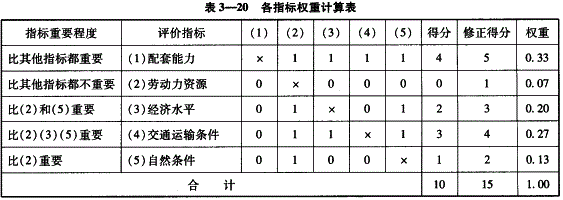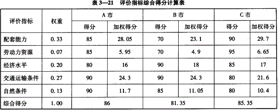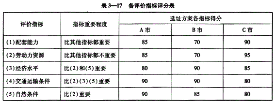 (2)现在国内有三个城市邀请该国外汽车公司进入其城市经济开发区投资建厂。咨询单位邀请有关方面的专家组成专家组,对申报城市的地理位置、自然条件、交通运输、经济环境等方面进行了综合考察,综合专家评审意见,确定了厂址选择的评价指标;同时专家组经过评审,确定了各项指标的重要程度,并为各个城市的各项指标按百分制进行打分。各评价指标及评分见表3-17。