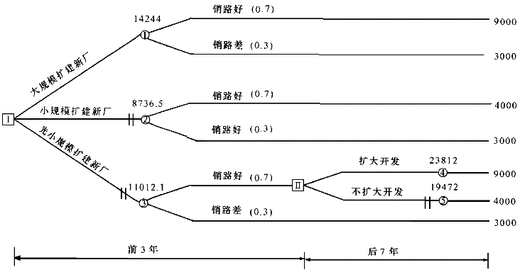 (1)销路好状态下的前3年小规模扩建,后7年再次扩建。