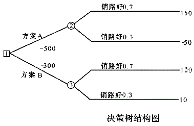 首先,画出决策树。此题中有一个决策点,两个备选方案,每个方案又面临着两种状态。由此,可画出其决策树,如下图所示。