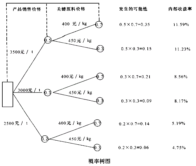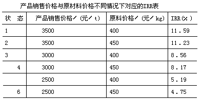 某企业拟投资一个项目,估算总投资11913万元。预计年销售收入6488万元,税后财务内部收益率(IRR)为11.59%。该项目存在两个主要风险变量,即产品销售价格和关键原料价格可能与预期有所不同。产品销售价格估计值为3500元/t,该关键原料价格估计值为400元/kg,产品销售价格可能出现三种情况:有50%的可能为原估计值3500元/t,有30%的可能为3000元/t,有20%的可能为2500元/t;该关键原料的价格可能出现两种情况:有70%的可能为原估计值400元/kg,有30%的可能为450元/kg。各种可能出现的情况以及对应的IRR见下表。