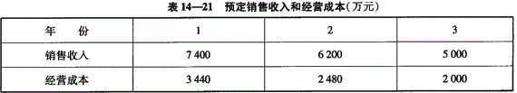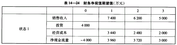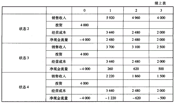 项目投资发生在第1年年初,当年投产运营。项目的寿命期3年,预定销售收入和经营成本数据见表14-21。在不同状态下经营成本保持不变。财务基准收益率为10%。