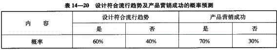 某时装公司拟投资4000万元开发一个时装设计生产项目,项目的成败取决于时装的设计是否符合流行趋势,且营销是否成功。通过采用专家调查法进行分析,认为可能出现四种状态:状态I,设计符合流行趋势,产品营销获得成功,实现预定的销售收入;状态Ⅱ,设计符合流行趋势,但产品营销不成功,只能实现预定销售收入的80%;状态Ⅲ,设计不符合流行趋势,但成功的营销有效改善了销售效果,可以实现预定销售收入的50%;状态Ⅵ,设计不符合流行趋势,且产品营销失败,只能实现预定销售收入的30%。时装设计符合流行趋势及产品营销成功的概率预测见表14-20。