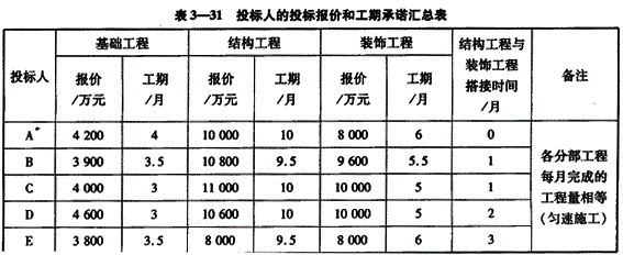4.A投标人:承诺工期=(4+10+6)个月=20个月;报价=(4200+10000+8000)万元=22200万元。