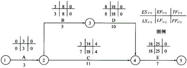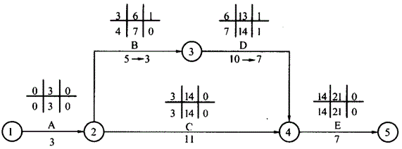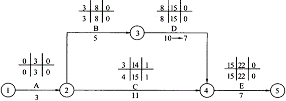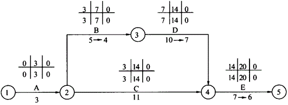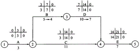 按此方案压缩,从图中的计算可以得出,关键线路为A→C→E;工期T2=21天,相应增加的费用为7×2=14万元,总费用为608万元。此方案虽然可行,但实际上造成在节点④需要等工的情况,且造成相应的费用浪费,故不可取。因此,只压缩B工作1天,压缩后的网络计划如图所示。