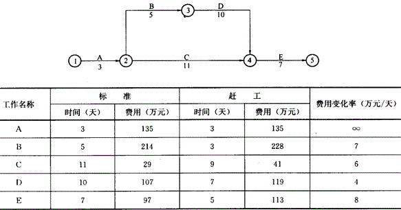 已知某分部工程由A、B、C、D、E五项工作组成,其网络计划如下图所示,要求该分部工程必须在20天内完成。为了保证工期,需要进行赶工,相关的数据资料如下表所示。