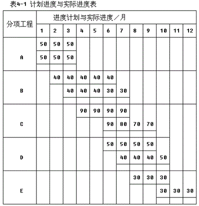 某设备安装工程计划进度与实际进度如表4-1所列。表中实线表示计划进度,计划进度线上方的数据为每月计划投资;虚线表示实际进度,实际进度线上方的数据为每月实际投资。各分项工程每月计划完成和实际完成的工程量相符。