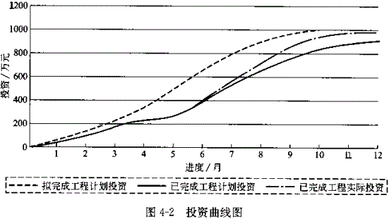 2.拟完工程计划投资曲线、已完工程实际投资曲线和已完工程计划投资曲线如图4-2所示。