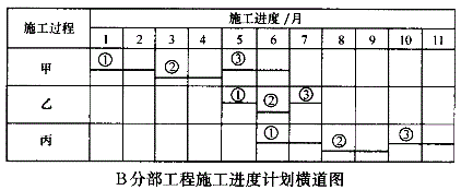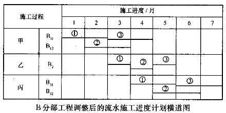 (4)B分部工程调整后的流水施工进度计划横道图如下图所示。