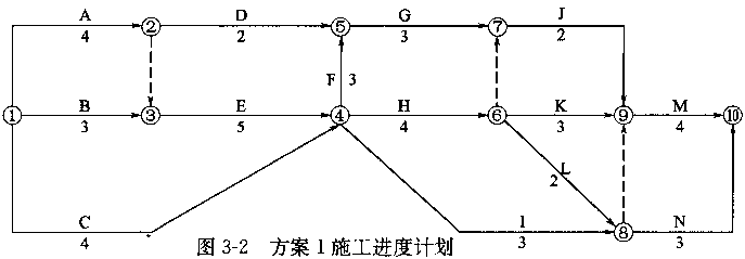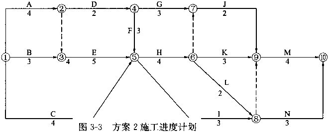 2.当该计划执行3个月后,建设单位提出增加一项新的工作F。根据施工组织的不同,工作F可有两种安排方案。方案1如图3-2所示;方案2如图3-3所示。经监理工程师确认,工作F的持续时间为3个月。比较两种组织方案哪一个更合理?为什么?