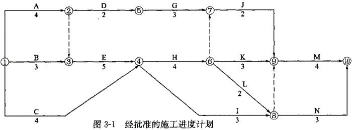 施工合同中规定,土方工程量超出原估计工程量15%时,新的土方单价应调整为15元/m3。经监理工程师审核批准的施工进度计划如图3-1所示(时间单位:月)。其中工作A、E、J共用一台施工机械,必须顺序施工。