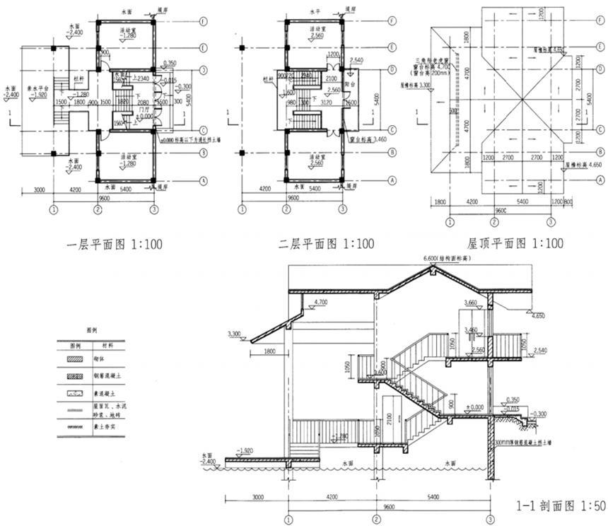 屋面:120mm厚现浇钢筋混凝土屋面板,坡度1/2,面贴屋面瓦,板底抹灰。屋面檐口处无檐沟和封檐板,平面图上屋檐标高为结构面标高。