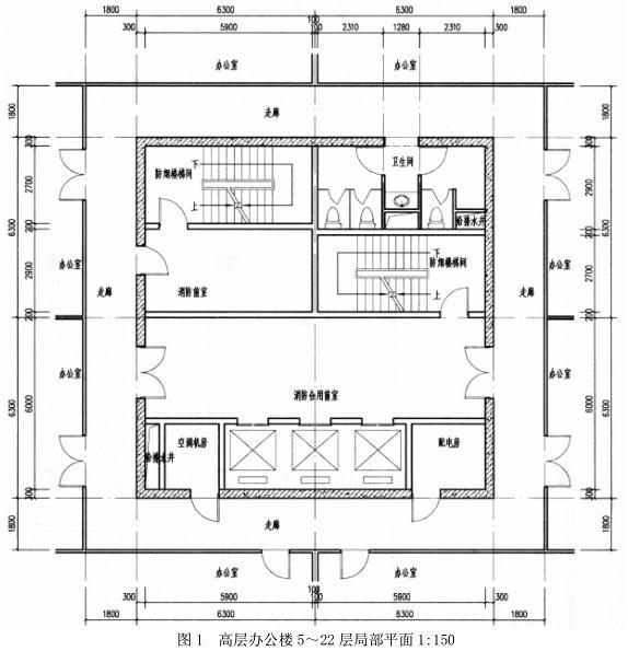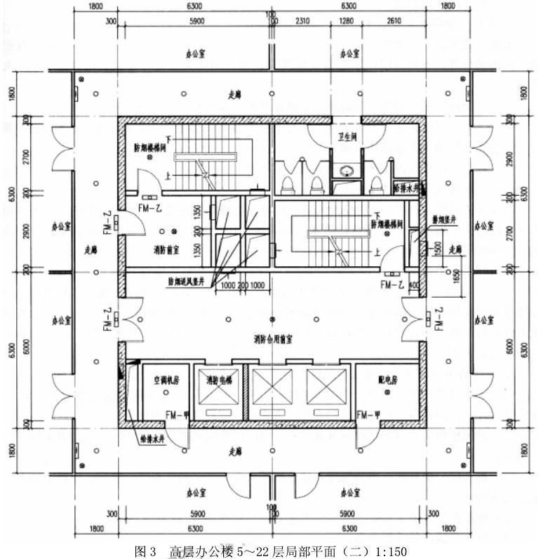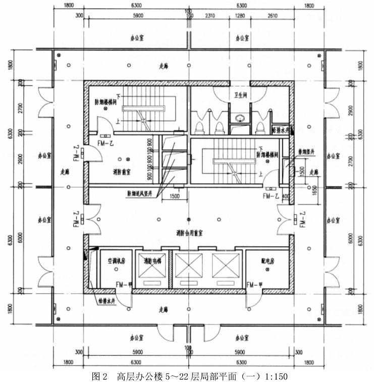 图1为建筑高度超过100m的办公大楼的走廊及核心筒部分平面图。按照要求做出部分消防系统的平面布置图。(不考虑办公室部分)
