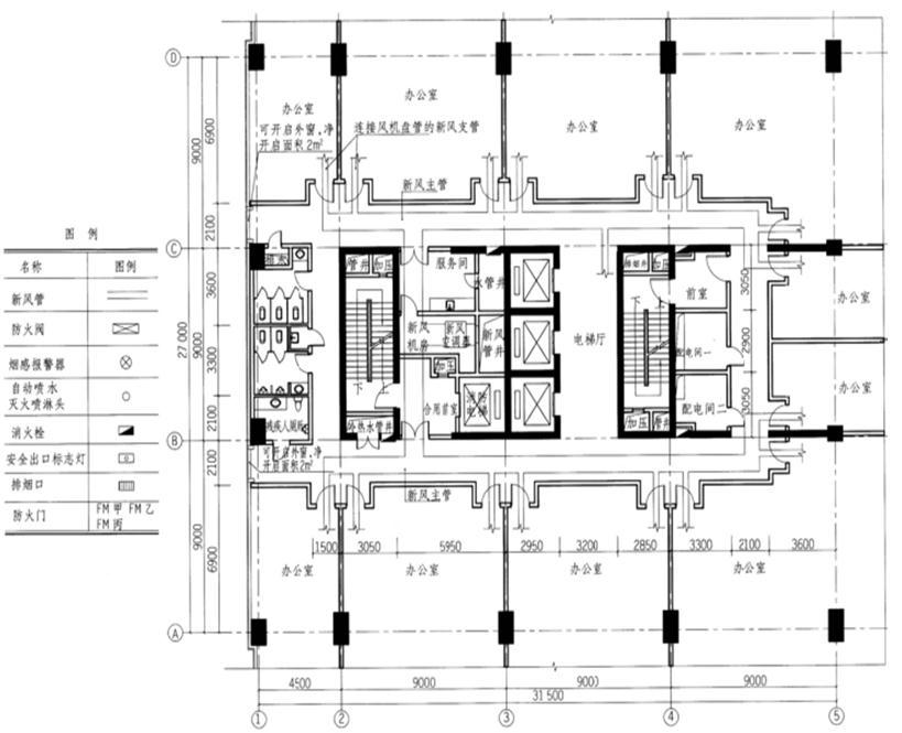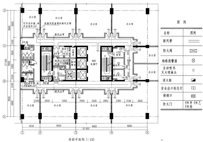 任务描述 某超高层办公楼高区标准层的面积为1950㎡,下图为其局部平面,已布置有部分消防设施,根据现行规范、任务要求和图例,完成其余消防设施的布置。 任务要求 1.布置新风管的防火阀。 2.布置烟感报警器和自动喷水灭火喷淋头(办公室、走廊、电梯厅和楼梯间除外)。 3.在未满足要求的建筑核心筒部位补设消火栓。 4.布置安全出口标志灯。 5.布置走廊排烟口。 6.标注防火门及其防火等级。
