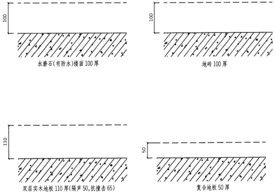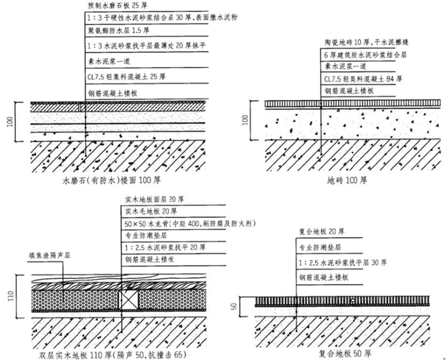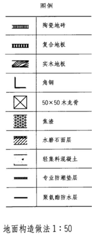 设计任务 根据以下所给图例画出以下四种地面的构造做法: 1.水磨石(有防水)楼面-110mm厚。 2.双层实木地板-110mm厚(隔声50mm,抗撞击65mm)。 3.复合地板楼面-50mm厚。 4.地砖楼面-100mm厚。 任务要求 要求清楚标明材料的构造层次并正确使用图例,各面层均考虑地板下敷设电线,但不要求在图中画出。