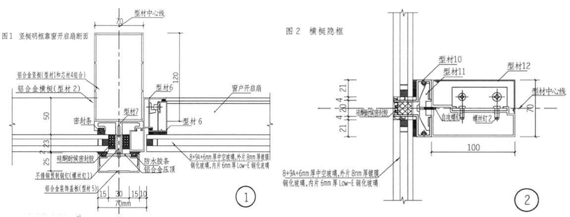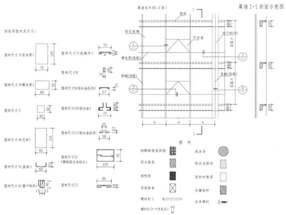 设计任务 依照图示提供的型材构件及尺寸绘出指定幕墙节点处构造详图。 任务要求 1.利用图示给出的型材和图例按比例绘制指定节点详图的剩余部分。 2.型材可以绘制简单形式并注明主要尺寸、节点构造层次、材料做法、厚度等。