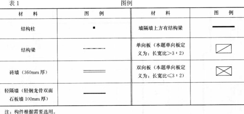 选用图例(表1)中的构件在图2中绘制二层墙体布置及屋顶结构布置图。