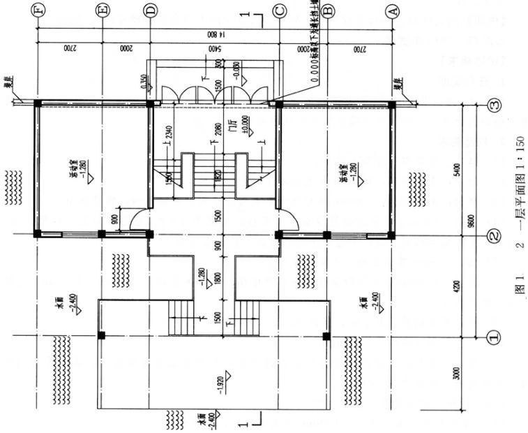 (1)一层平面从左到右依次剖切部位:水面(标高为-2.400m),邻水平台(标高为-1.920m),水面上空,邻水平台(标高为-1.280m),平台临空栏杆,梯段(标高为+0.000~1.600m),门厅地坪(标高为±0.000m),③轴挡土墙及外墙和外墙上的门,室外台阶(标高为-0.030m),室外地坪(标高为-0.300m)。