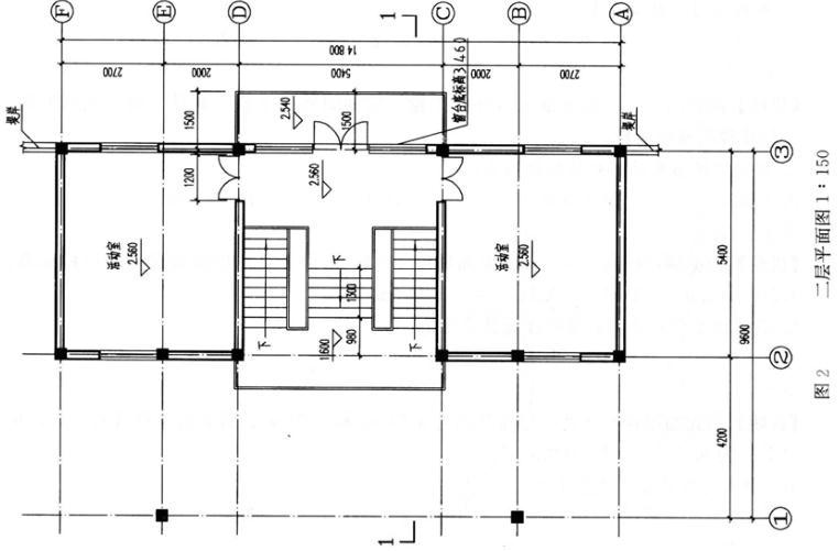 (2)二层平面从左到右依次看到部位:①轴柱投影线,休息平台(标高为1.600m)栏杆投影线,活动室转交外墙投影线,梯段(标高为1.600~2.560m)投影线,③轴左侧活动室外门投影线,③轴右侧室外露台栏杆投影线。