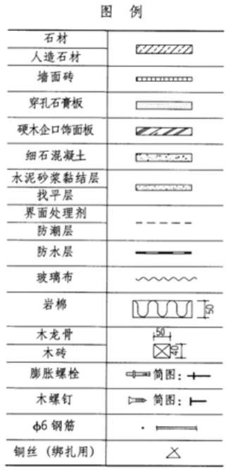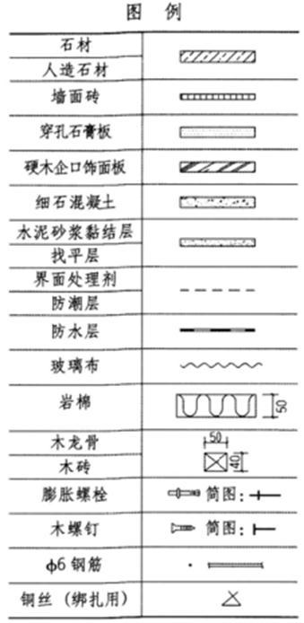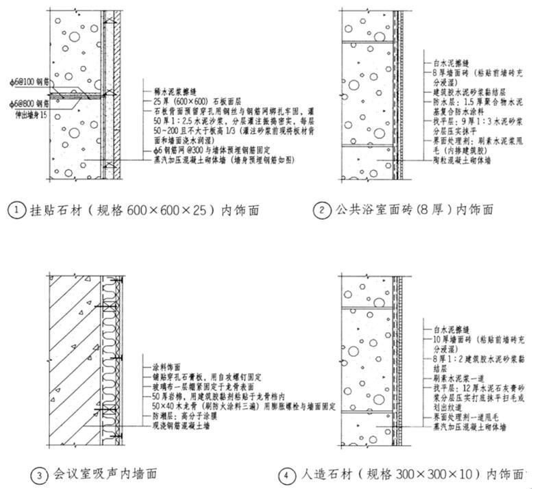 任务说明 按题目要求和图例所示的材料绘出不同室内墙体的内墙饰面构造做法,并注明材料名称。制图比例1:5。