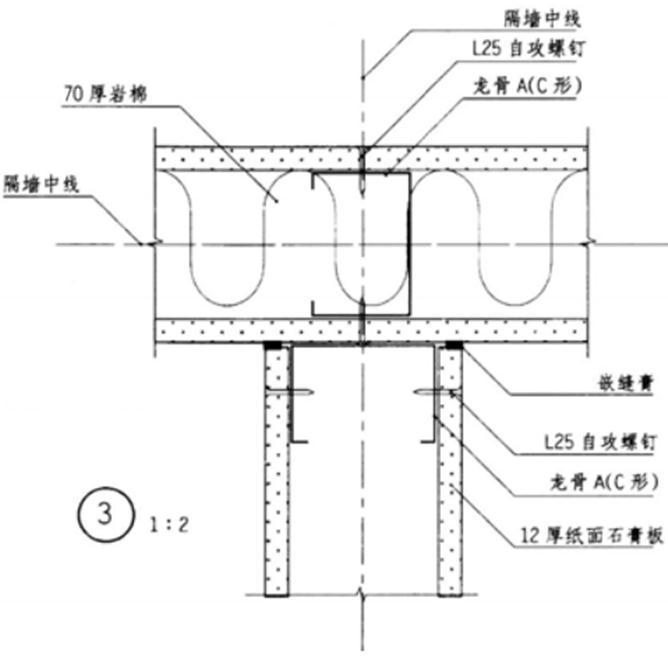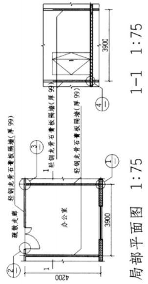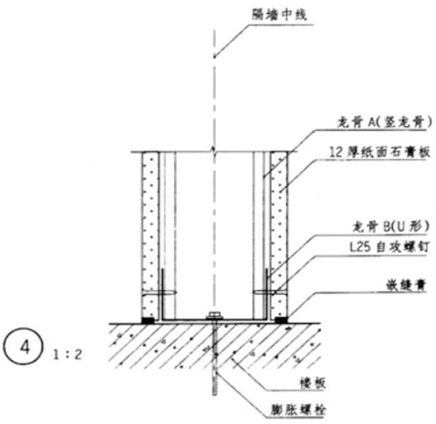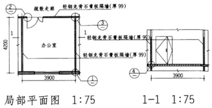 某8度抗震设防区多层办公楼层高3m,耐火等级二级,采用轻钢龙骨石膏板内隔墙,其局部平面、剖面和4个未完成的构造节点如图所示。按下列要求绘制完成构造节点。