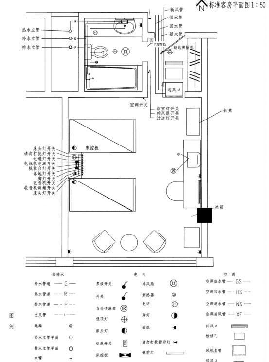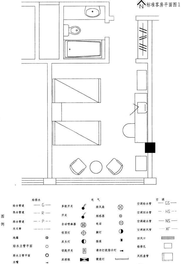 设计任务 根据所提供的某一高级旅馆标准客房平面图,用给出的图例符号绘出其电气、给排水和空调系统的配置图。