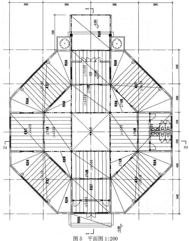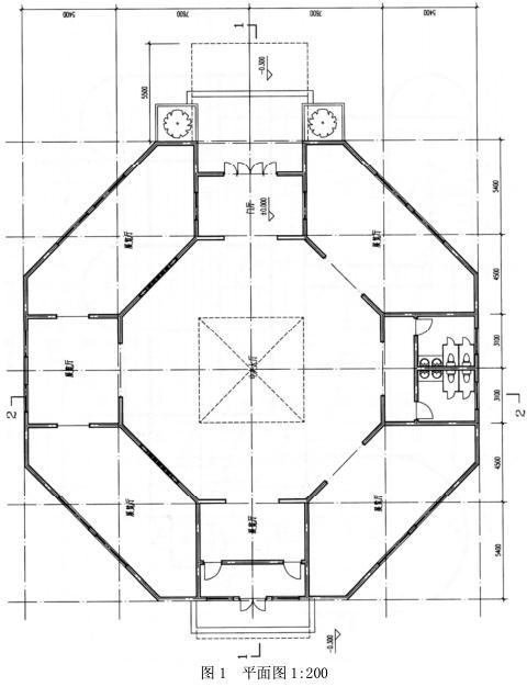 本工程平面为正八角形,四周展厅的屋面标高均相同,窗高相同。中央大厅为无柱大空间。剖面图仅表示空间关系,未表示结构构件。